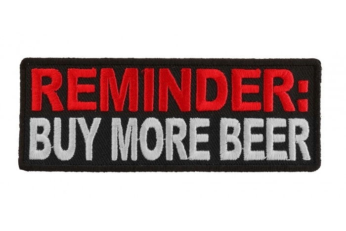 Reminder: Buy more beer patch is embroidered in white and red over black and measures 4x1.5 inches. Sew this reminder patch to your jacket and never forget to buy more beer.