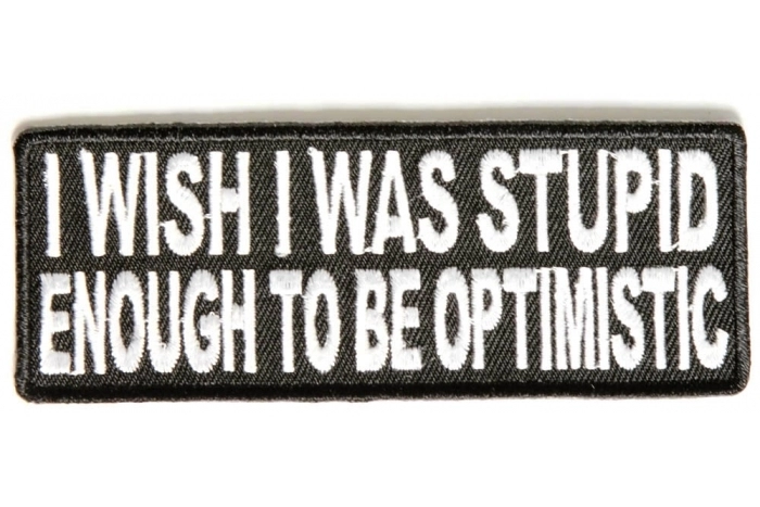A patch for all pessimists, "I wish I was stupid enough to be optimistic". The patch is embroidered in white over black and measures 4x1.5 inches