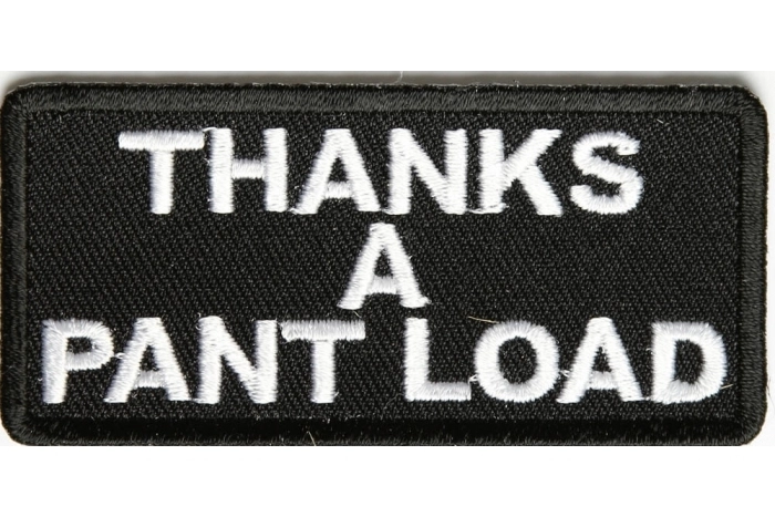 My father in laws favorite saying to his grandkids. Thanks a pant load. Better than cussing out and saying thanks for this shit. The iron on patch is 3x1.5 inches, embroidered in white over black. Can be sewed on as well as it features die cut borders.