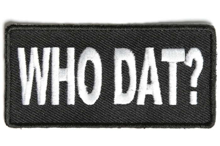 Who dat? Patch measures 3x1.5 inches embroidered in white over black. It's a saying out of Louisiana.