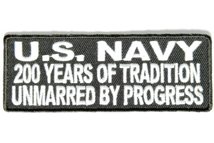 US Navy 200 years of tradition patch is embroidered in Black / White and measures 4x1.5 inches. You can sew or iron on this patch. If you are applying to leather refrain from ironing on the patch. The embroidered badge does feature die cut borders so you can easily sew it on. You can purchase patches wholesale from us as well.