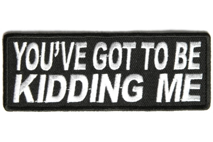 You've got to be kidding me patch is embroidered in Black / White and measures 4x1.5 inches. You can sew or iron on this patch. If you are applying to leather refrain from ironing on the patch. The embroidered badge does feature die cut borders so you can easily sew it on. You can purchase patches wholesale from us as well.