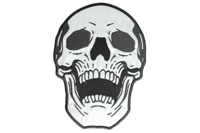 A simple to the point reflective skull patch. Large patch measures 7x10 inches. Check out the size over a leather vest in images