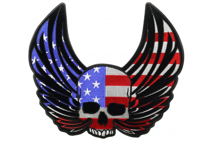 American Flag Skull with Wings Large Back Patch measures 10x9 inches and is Embroidered in Black / Red / White / Blue. The Large Patch can be sewn on or ironed on to clothing such as Denim or Leather Jackets, Vests, Hats, Back Packs, Shirts. Features plastic backing and embroidered die cut borders.