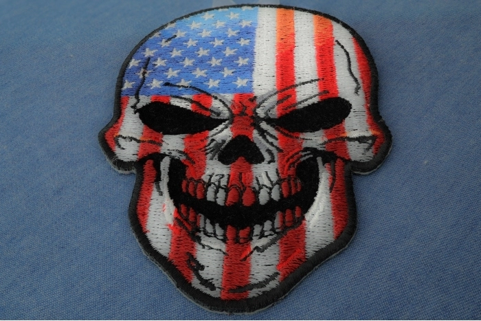 American Flag Small Skull Patch measures 3x4.3 inches and is Embroidered in Red / White / Blue / Black. The Small Patch can be sewn on or ironed on to clothing such as Denim or Leather Jackets, Vests, Hats, Back Packs, Shirts. Features plastic backing and embroidered die cut borders.