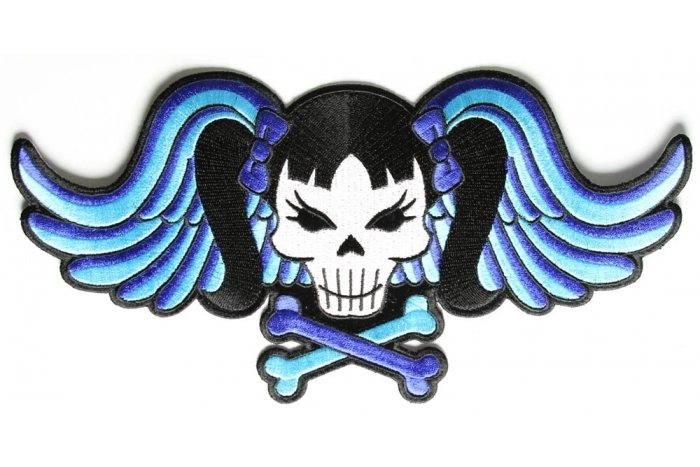 This large patch of skull with pig tails tied in cute little bows with a criss crossing bones beneath it. The large patch measures 10x5 inches. Embroidered in blue black and gray.