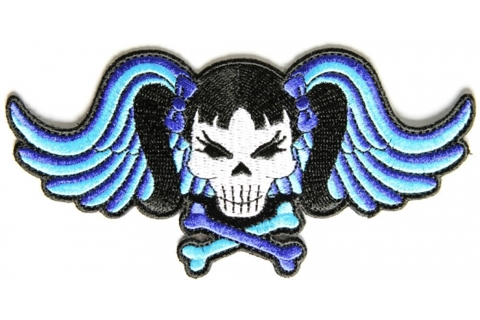 This small patch shows a skull with pigtails tied in cute little bows with criss crossing bones beneath it. The small skull patch measures 5x2.5 inches. Embroidered in blue black and gray.