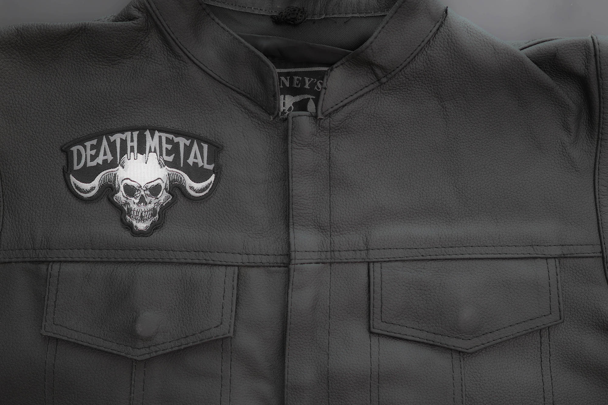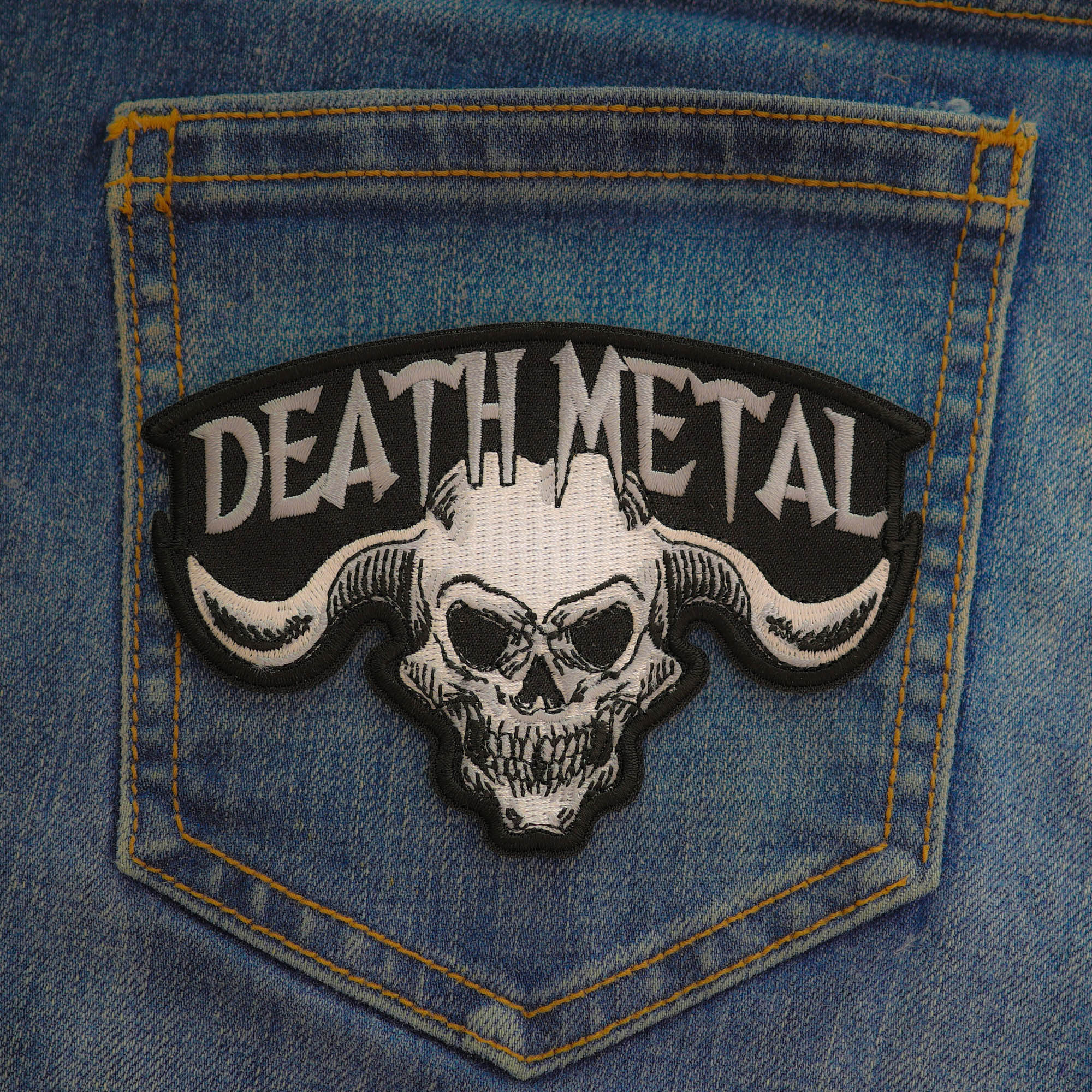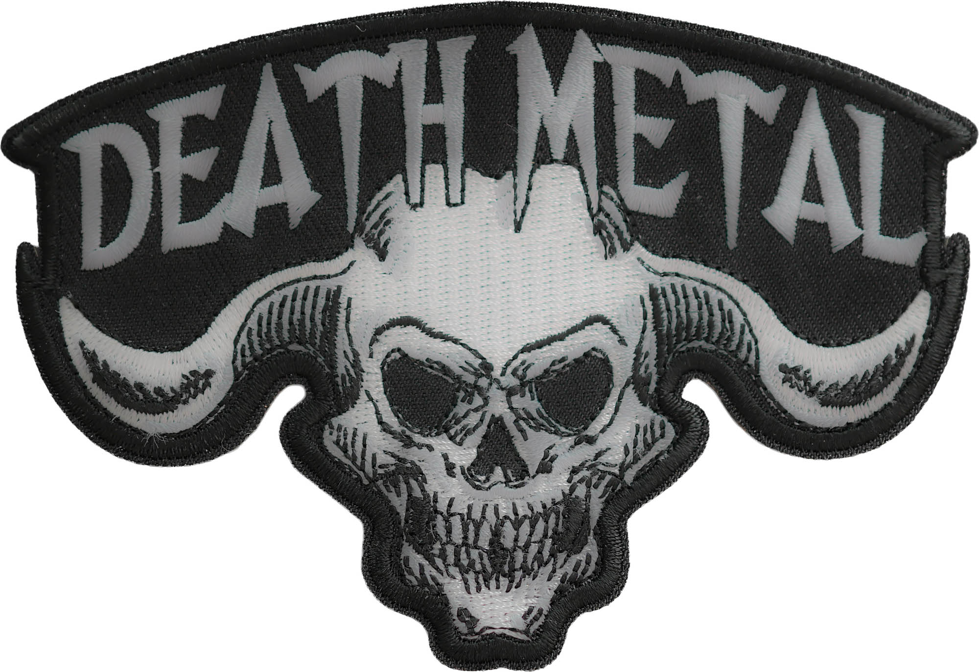 Death Metal Skull Patch measures 4.5x3 inches and is Embroidered in Black / White / Gray. The patch can be sewn on to Leather Biker Jackets, Vests or Chaps. The patch can also be ironed on to Shirts, Hats or Denim material such as Jeans. Features plastic iron on backing and clean laser cut embroidered borders. Japanese made iron on glue requires temperature between 270-290 Degrees Fahrenheit. Use a heat press for 30 seconds to adhere the patch permanently to your clothing. Using a regular household iron will probably not be as permanent as one hopes. If possible we recommend you sew on your patches for a more durable application. Never iron on patches to Leather or Nylon materials.