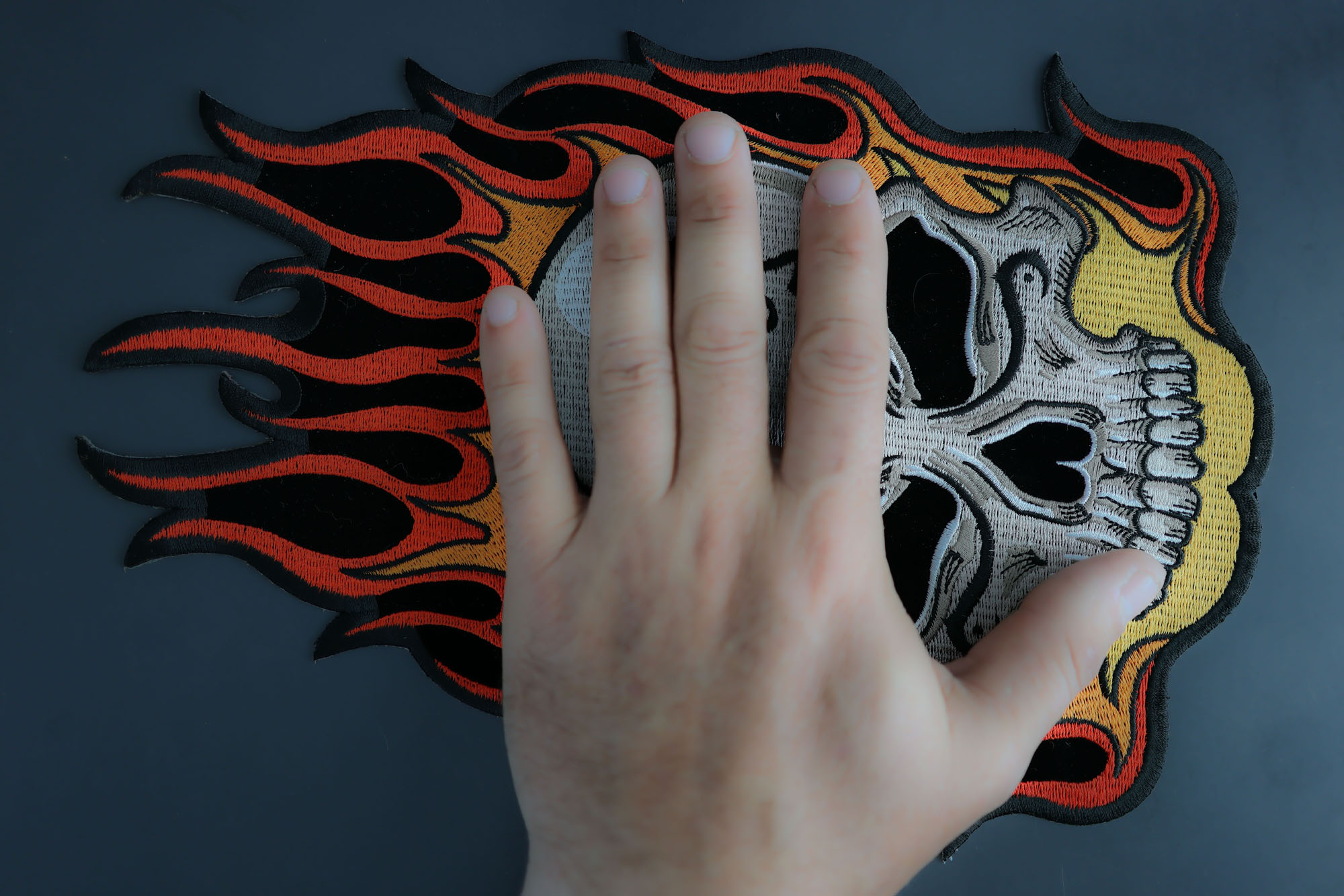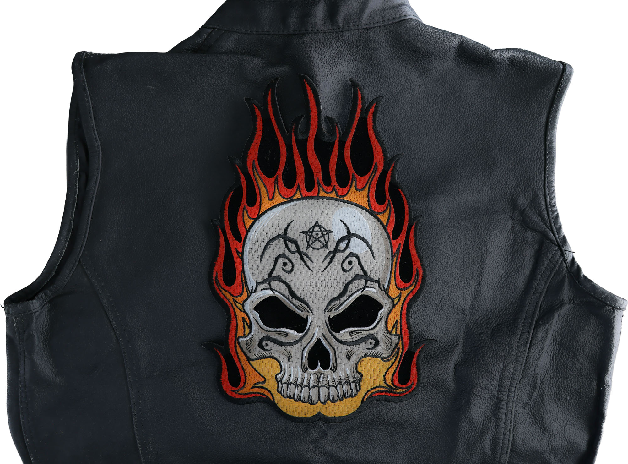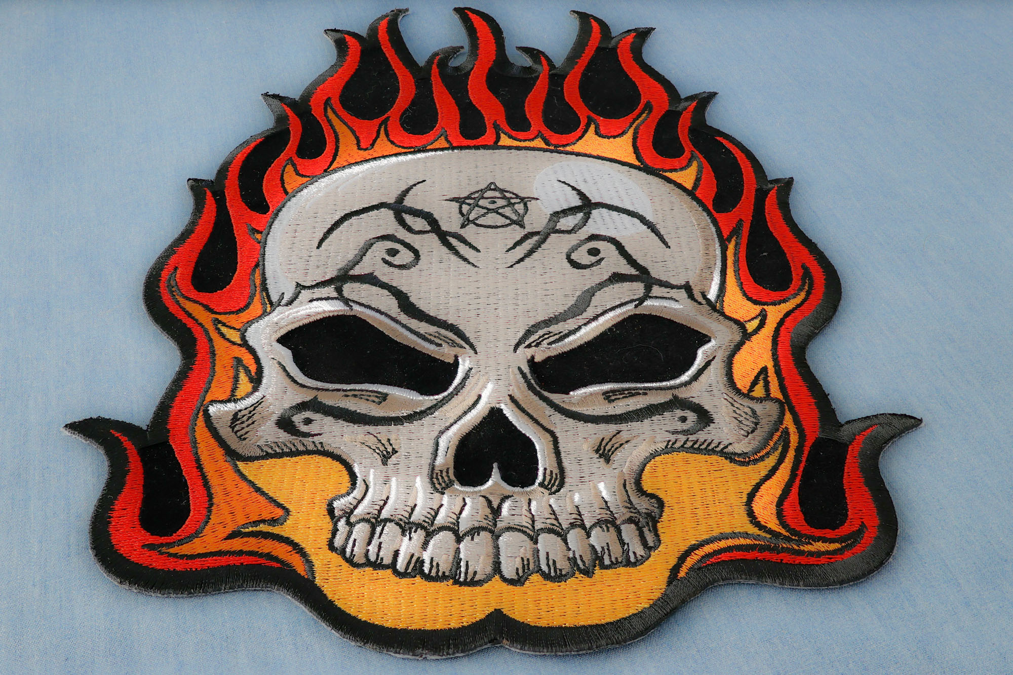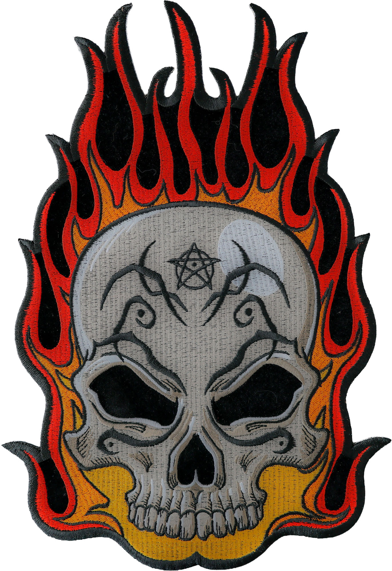 Flaming Tattoo Skull Large Back Patch measures 8.4x12 inches and is Embroidered in Black / White / Red / Orange. The patch can be sewn on to Leather Biker Jackets, Vests or Chaps. The patch can also be ironed on to Shirts, Hats or Denim material such as Jeans. Features plastic iron on backing and clean laser cut embroidered borders. Japanese made iron on glue requires temperature between 270-290 Degrees Fahrenheit. Use a heat press for 30 seconds to adhere the patch permanently to your clothing. Using a regular household iron will probably not be as permanent as one hopes. If possible we recommend you sew on your patches for a more durable application. Never iron on patches to Leather or Nylon materials.