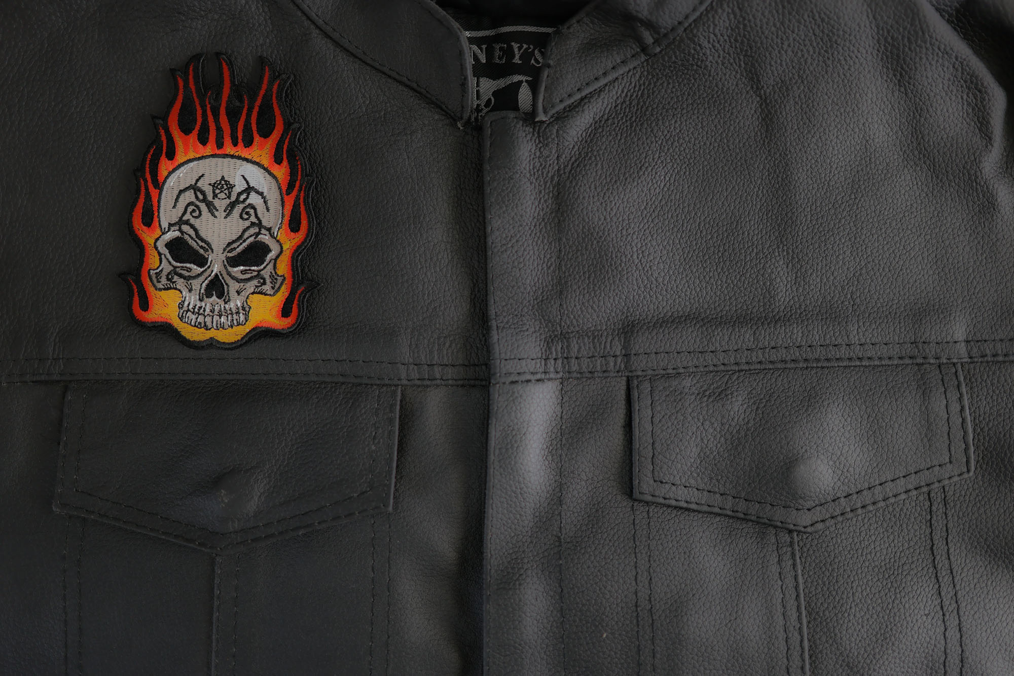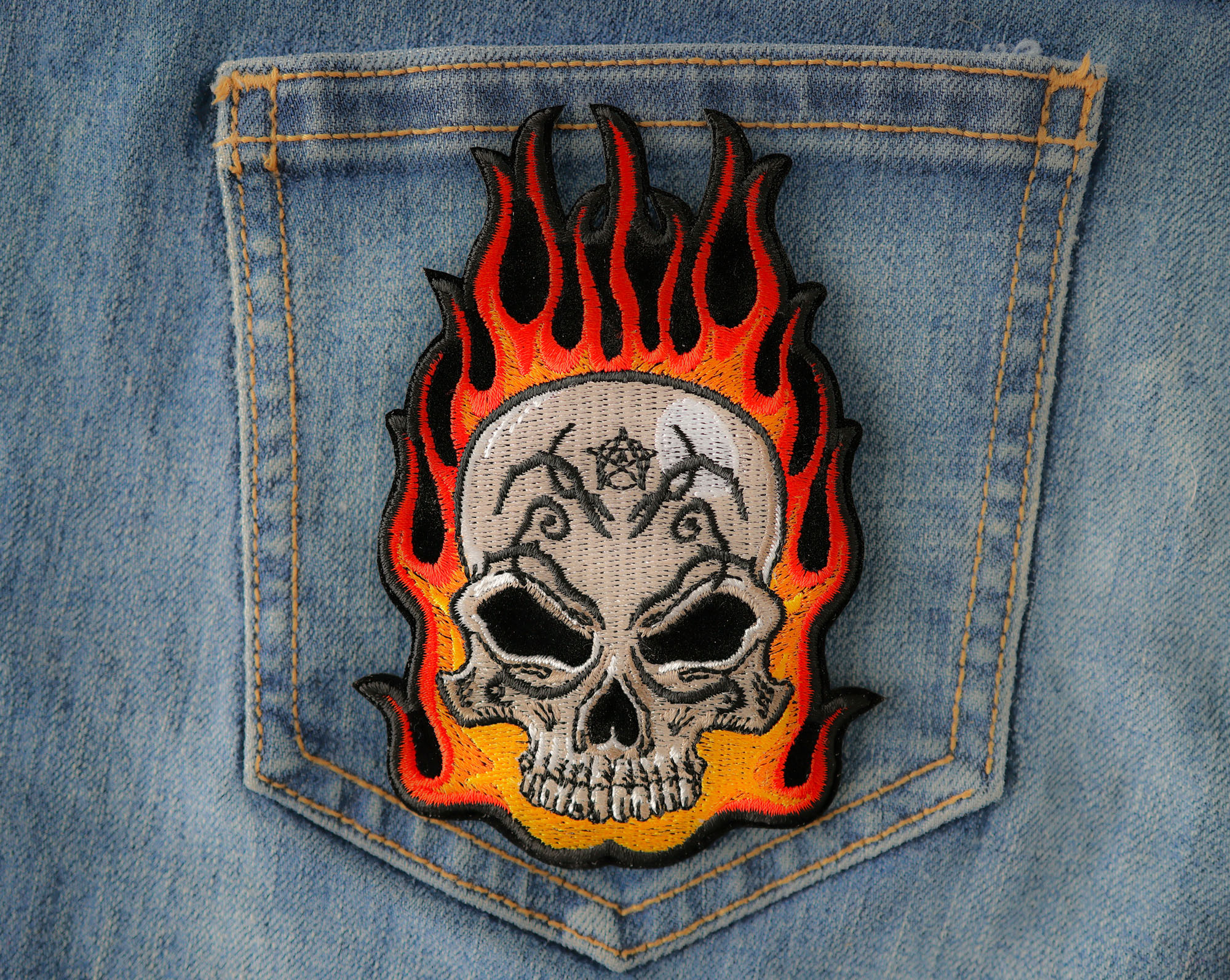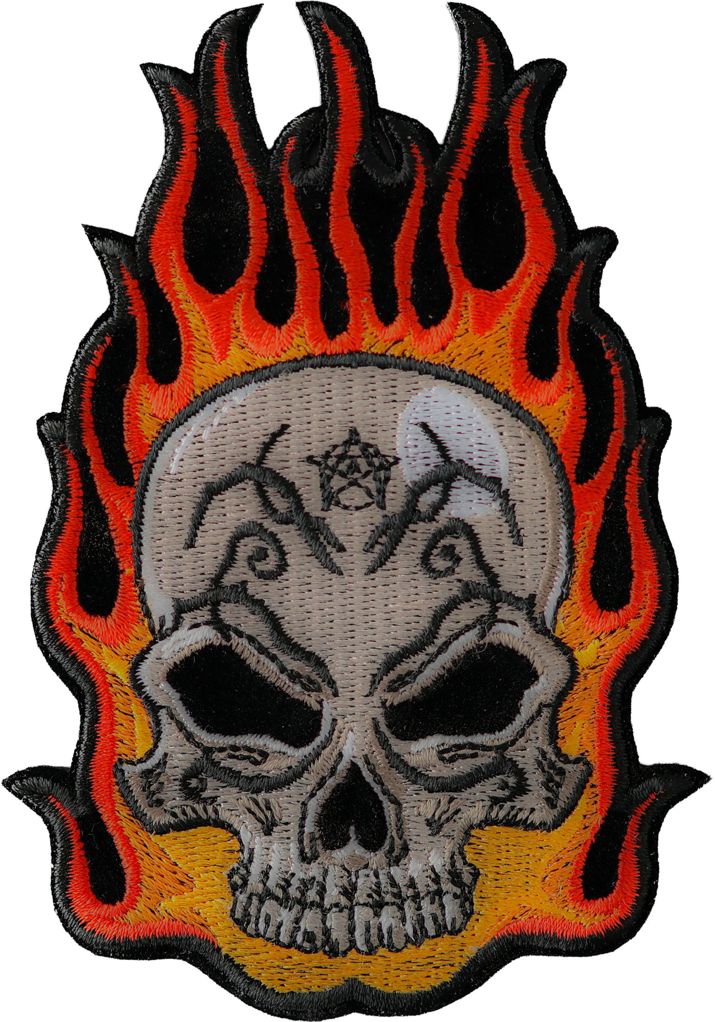 Flaming Tattoo Skull Patch measures 3.1x4.5 inches and is Embroidered in Black / White / Red / Orange. The patch can be sewn on to Leather Biker Jackets, Vests or Chaps. The patch can also be ironed on to Shirts, Hats or Denim material such as Jeans. Features plastic iron on backing and clean laser cut embroidered borders. Japanese made iron on glue requires temperature between 270-290 Degrees Fahrenheit. Use a heat press for 30 seconds to adhere the patch permanently to your clothing. Using a regular household iron will probably not be as permanent as one hopes. If possible we recommend you sew on your patches for a more durable application. Never iron on patches to Leather or Nylon materials.