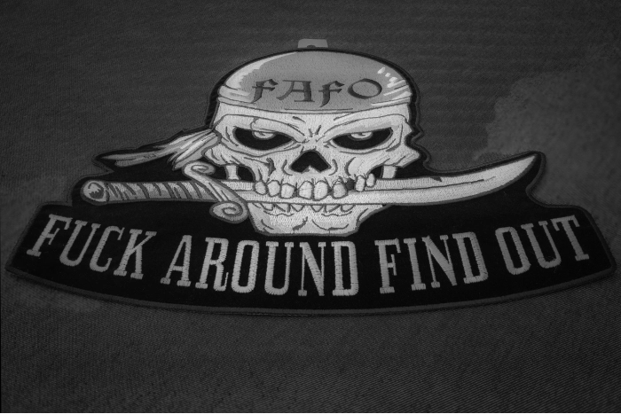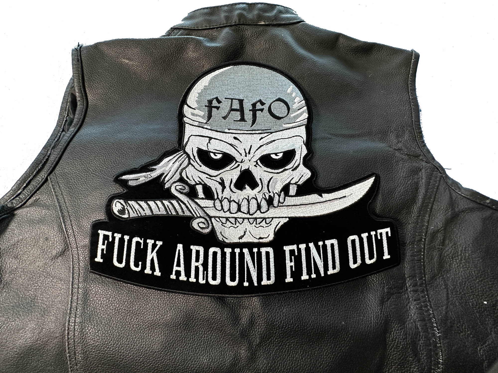 The embroidered patch in the photo features a bold and confrontational design centered on a skull, paired with a provocative message. The skull, facing forward, is stitched in shades of white and gray with black shading to emphasize its hollow eye sockets, nasal cavity, and toothy grin, giving it a menacing expression. Above the skull, the acronym "FAFO" is embroidered in a stylized, distressed font, also in white, which stands for the phrase below. A dagger with a detailed handle and blade, stitched in gray, pierces through the skull horizontally, with the blade emerging from the skull's mouth, adding a rebellious and dangerous vibe. A small feather, possibly part of a Native American-inspired element, hangs from the dagger's handle, embroidered in white and gray. Below the skull, a rectangular banner stretches across the bottom of the patch, stitched in white with a distressed edge, bearing the phrase "FUCK AROUND FIND OUT" in all capital letters, embroidered in black for stark contrast. The patch has a black background with a black zigzag stitch border that follows the irregular contours of the design, set against a dark fabric surface, likely denim, which enhances the monochromatic scheme. This patch, with its skull, dagger, and defiant message, likely appeals to those embracing a rebellious or edgy aesthetic, intended for decorative use on jackets or vests to make a strong, unapologetic statement.