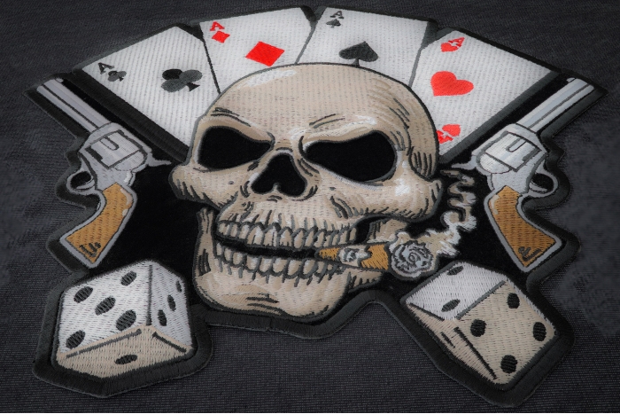 The embroidered patch features a rebellious design centered on a skull with a cigar in its mouth, set against a backdrop of four playing cards—aces of spades, clubs, diamonds, and hearts—symbolizing a high-stakes gamble. The skull, stitched in beige with black shading for a menacing look, is framed by two crossed revolvers with brown handles and gray barrels, adding a Wild West or outlaw vibe. Below the skull, a pair of dice showing sixes, embroidered in white with black dots, reinforces the theme of risk and chance, while a single rose with a red center and gray petals near the cigar adds a touch of contrast, possibly symbolizing beauty amidst danger. The patch, bordered by a black zigzag stitch, is set on a dark fabric, likely denim, and its edgy imagery of gambling, guns, and mortality likely appeals to those embracing a daring, nonconformist style, perfect for decorating jackets or vests.