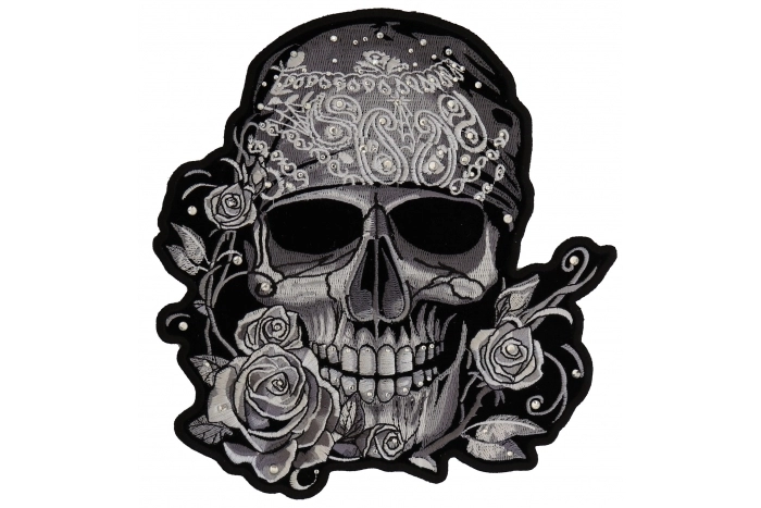 Gray Bandana Skull Patch with Roses and Rhinestones is embroidered in Black / Gray. Measures 8x8 inches. The patch can be sewn or ironed on. Do not iron on patches to leather or nylon material.