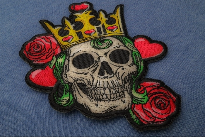 Hearts Queen Skull Patch measures 4x4 inches and is Embroidered in Black / White / Red / Yellow / Green. The patch can be sewn on to Leather Biker Jackets, Vests or Chaps. The patch can also be ironed on to Shirts, Hats or Denim material such as Jeans. Features plastic iron on backing and clean laser cut embroidered borders. Japanese made iron on glue requires temperature between 270-290 Degrees Fahrenheit. Use a heat press for 30 seconds to adhere the patch permanently to your clothing. Using a regular household iron will probably not be as permanent as one hopes. If possible we recommend you sew on your patches for a more durable application. Never iron on patches to Leather or Nylon materials.