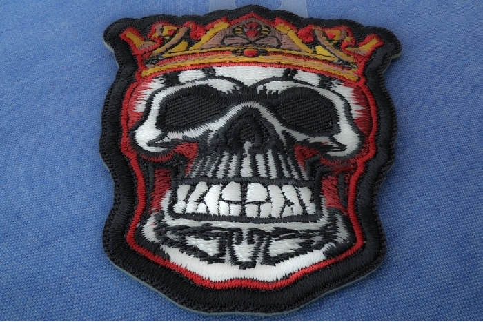King Skull Patch Embroidered measures 2.5x3 inches and is Embroidered in Black / Brown. The patch can be sewn on to Leather Biker Jackets, Vests or Chaps. The patch can also be ironed on to Shirts, Hats or Denim material such as Jeans. Features plastic iron on backing and clean laser cut embroidered borders. Japanese made iron on glue requires temperature between 270-290 Degrees Fahrenheit. Use a heat press for 30 seconds to adhere the patch permanently to your clothing. Using a regular household iron will probably not be as permanent as one hopes. If possible we recommend you sew on your patches for a more durable application. Never iron on patches to Leather or Nylon materials.