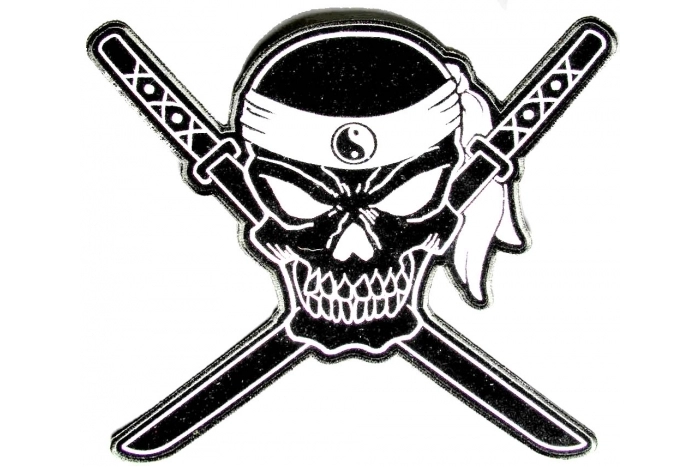 Large version of the black and white skull patch with cross swords and headband another original new design from Arturo Vilmenay, measures 12x10 inches. Embroidered in white over black velvet.