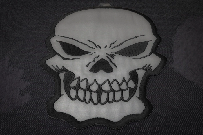 Large Reflective Skull Patch measures 8x11 inches and is Embroidered in Black / Reflective. The Large Patch can be sewn on or ironed on to clothing. You should sew patches on to leather jackets or vests. Refrain from ironing on patches to nylon or leather material. The correct iron on temperature is 270 degrees Fahrenheit. If you are using a household iron you should press down for 30 seconds. If you are using a heat press 12 seconds is sufficient. The patch features clean cut embroidered borders which will make it easy to sew on. We cannot recommend an iron setting which will yield you 270 degrees temperature. You can use a frying pan thermometer to find the correct setting of your iron. The temperature setting is very important. Plus or minus 10 degrees of variation is acceptable. But you should never go over 280 degrees Fahrenheit when ironing on the patch. Anything under 260 will also not activate the glue properly. The recommended 270 degrees Fahrenheit setting applies to all our iron on patches. We cannot speak for other manufacturers though. We spend the extra dime to use Japanese brand glue which works very well if applied at the right temperature.