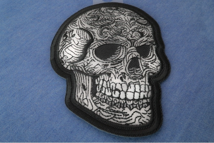 Nonetheless, we expect that the image depicted here is something that our skull-friendly customers will appreciate. The patch measures 3 x 4 inches and includes a thick, black, die-cut border all the way around. The border gives definition along with a nice space to hide some black thread should you choose to mount this patch by sewing it to your clothing.