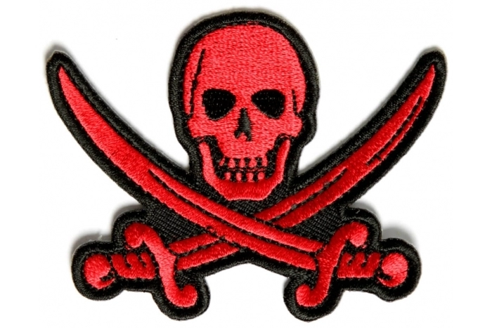 Red Skull Patch with Pirate Swords crossed over. Embroidered patch with iron on backing and die but black borders. Measures 3x2.25 inches in length.