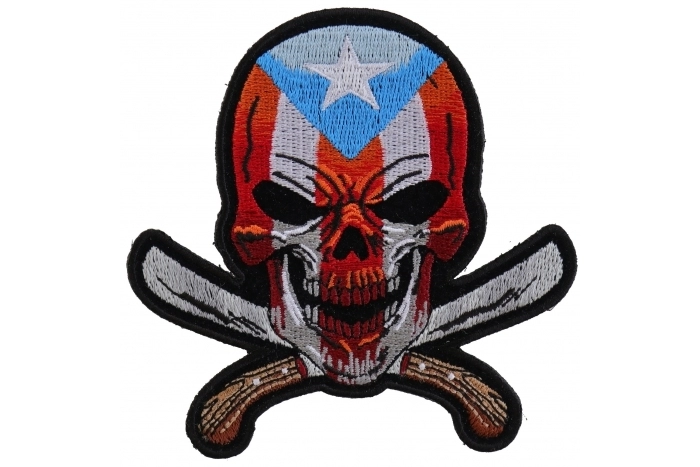 Puerto Rican Skull with Machetes Patch measures 4x4 inches and is Embroidered in Red / White / Blue / Black. The Small Patch can be sewn on or ironed on to clothing such as Denim or Leather Jackets, Vests, Hats, Back Packs, Shirts. Features plastic backing and embroidered die cut borders.