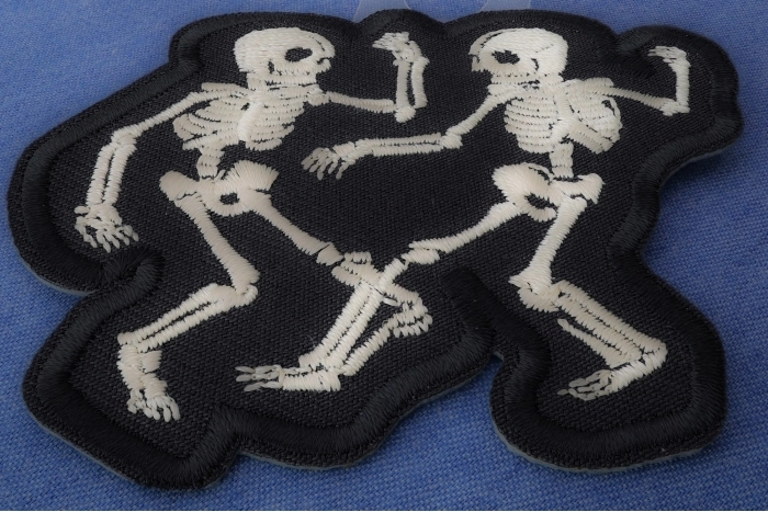 Rave Skeletons Dancing Patch Embroidered measures 3x2.75 inches and is Embroidered in Black / Gray. The patch can be sewn on to Leather Biker Jackets, Vests or Chaps. The patch can also be ironed on to Shirts, Hats or Denim material such as Jeans. Features plastic iron on backing and clean laser cut embroidered borders. Japanese made iron on glue requires temperature between 270-290 Degrees Fahrenheit. Use a heat press for 30 seconds to adhere the patch permanently to your clothing. Using a regular household iron will probably not be as permanent as one hopes. If possible we recommend you sew on your patches for a more durable application. Never iron on patches to Leather or Nylon materials.