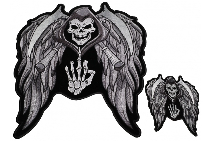 - Reaper Skull With Sickle and Wings Small and Large Biker Patch Set