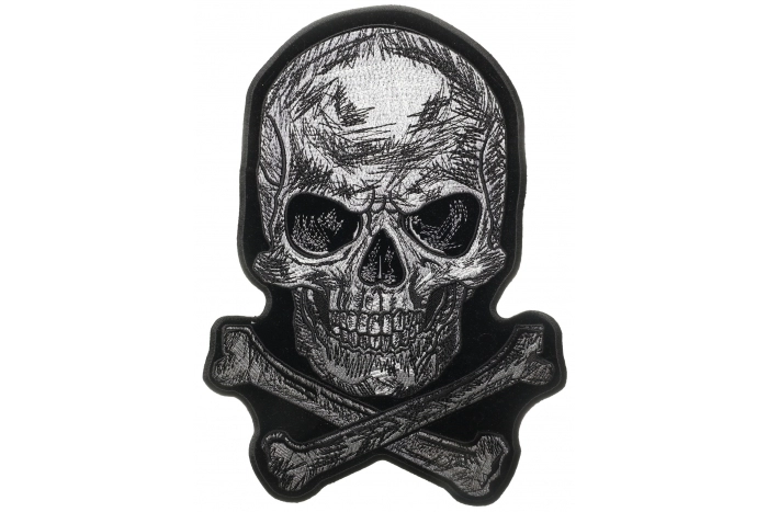 Scratched Skull and Crossbones Large Back Patch measures 7.4x10 inches and is Embroidered in Black / White / Gray. The Large Patch can be sewn on or ironed on to clothing such as Denim or Leather Jackets, Vests, Hats, Back Packs, Shirts. Features plastic backing and embroidered die cut borders.