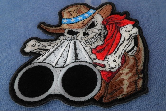 Add a touch of outlaw flair to your gear with the Shotgun Willy Skull Patch Small, perfect for jackets, vests, or bags. Measuring 4 x 4 inches, this embroidered patch features a rugged cowboy skull with a bandanna and shotgun barrels crossed beneath, as shown in the main image against a stark white background. The skull’s gray tones contrast with the red bandanna and brown hat, while blue and black accents bring the design to life, all stitched with precision using 100% rayon thread. Built on velvet fabric with a plastic backing and Japanese iron-on glue, it’s easy to apply—heat press at 280°F for 30 seconds or sew for a permanent hold. The image highlights the patch’s detailed embroidery and clean, die-cut borders, filling the frame with its bold, biker-ready style. Ideal for veterans, riders, or anyone with a rebellious streak, this patch transforms denim or leather into a statement of grit and character.