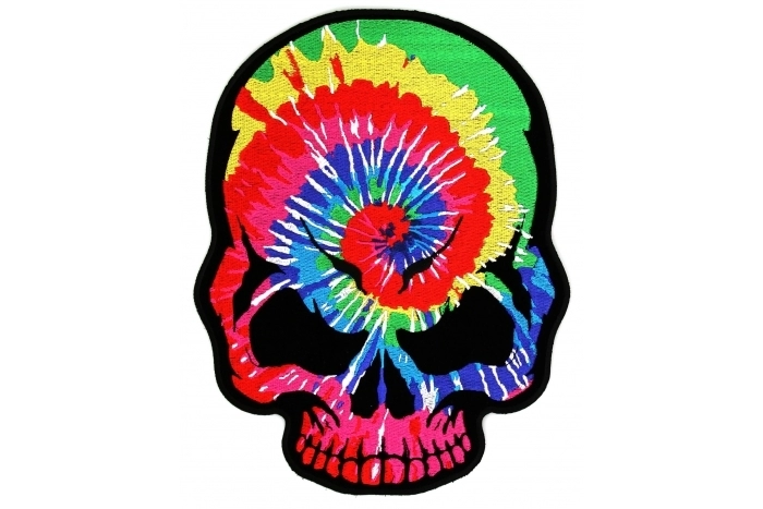 Tie Dye Skull Large Back Patch measures 8x10 inches and is Embroidered in Black / Green / Yellow / Red / Pink / Blue. The Large Patch can be sewn on or ironed on to clothing such as Denim or Leather Jackets, Vests, Hats, Back Packs, Shirts. Features plastic backing and embroidered die cut borders.