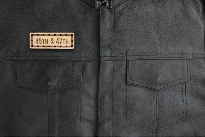 45th and 47th Solid Oak Laser Engraved Wooden Patch measures 3.5x1.25. Laser cut and engraved right here in Florida USA. We make these so you can decorate your motorcycle jacket by sewing on this wooden patch through the holes. This version is made out of quarter inch thick solid oak. You can also, at your own discretion, stick a peel and stick magnet on the back and use it as a fridge magnet. You can nail or glue it to a wall as decor. You can add a key ring to one of the corner holes and use it as a keychain.