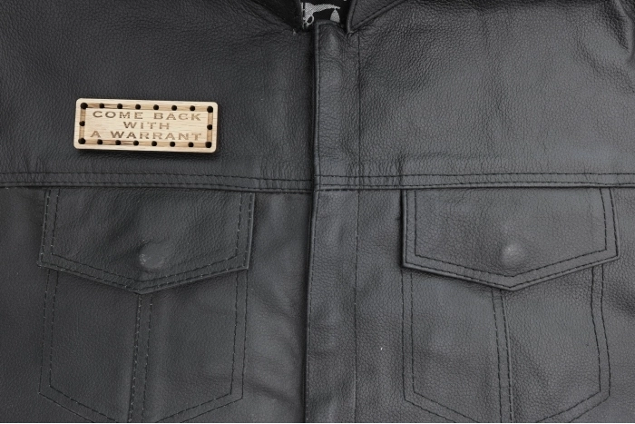 Come Back with a Warrant Oak Wood Patch measures 3.5x1.25. Laser cut and engraved right here in Florida USA.