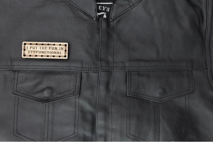 I put the fun in dysal Wood Oak Patch measures 3.5x1.25. Laser cut and engraved right here in Florida USA.