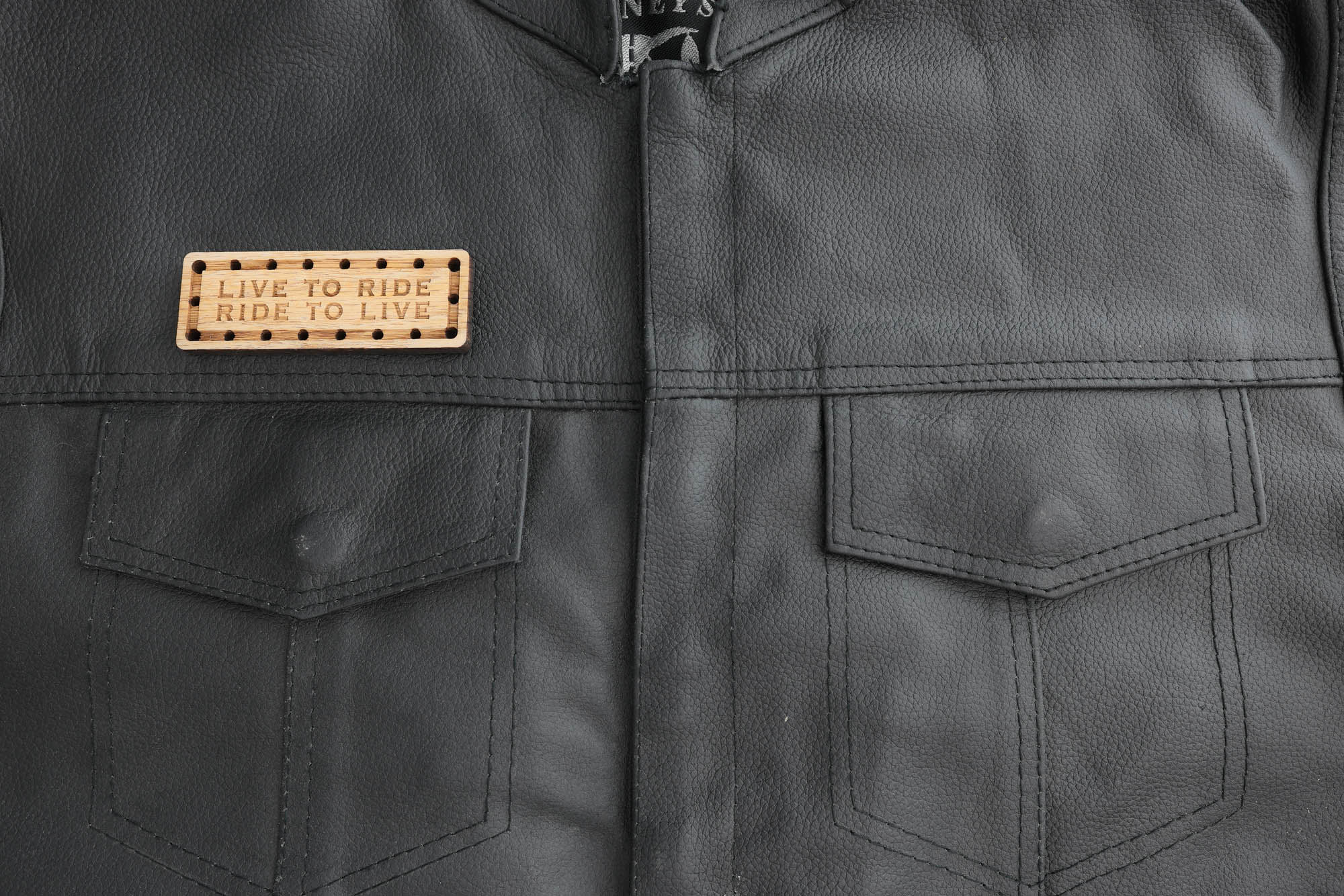 Live to Ride Ride to Live Oak Wood Patch measures 3.5x1.25. Laser cut and engraved right here in Florida USA. We make these so you can decorate your motorcycle jacket by sewing on this wooden patch through the holes. This version is made out of quarter inch thick solid oak.