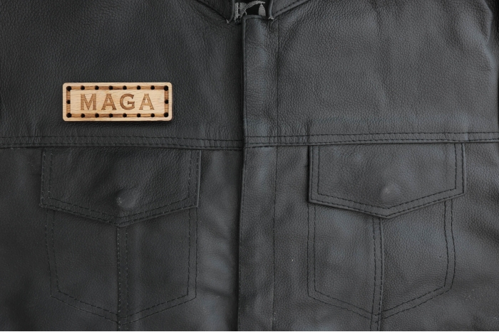 MAGA Solid Oak Laser Engraved Wooden Patch measures 3.5x1.25. Laser cut and engraved right here in Florida USA. We make these so you can decorate your motorcycle jacket by sewing on this wooden patch through the holes. This version is made out of quarter inch thick solid oak. You can also, at your own discretion, stick a peel and stick magnet on the back and use it as a fridge magnet. You can nail or glue it to a wall as decor. You can add a key ring to one of the corner holes and use it as a keychain.