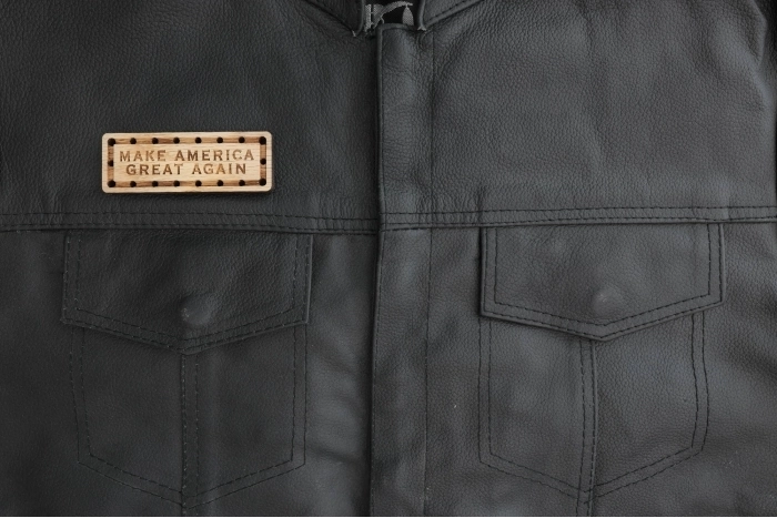 Make America Great Again Solid Oak Laser Engraved Wooden Patch measures 3.5x1.25. Laser cut and engraved right here in Florida USA. We make these so you can decorate your motorcycle jacket by sewing on this wooden patch through the holes. This version is made out of quarter inch thick solid oak. You can also, at your own discretion, stick a peel and stick magnet on the back and use it as a fridge magnet. You can nail or glue it to a wall as decor. You can add a key ring to one of the corner holes and use it as a keychain.