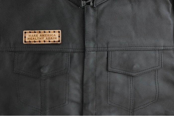 Make America Healthy Again Solid Oak Laser Engraved Wooden Patch measures 3.5x1.25. Laser cut and engraved right here in Florida USA. We make these so you can decorate your motorcycle jacket by sewing on this wooden patch through the holes. This version is made out of quarter inch thick solid oak. You can also, at your own discretion, stick a peel and stick magnet on the back and use it as a fridge magnet. You can nail or glue it to a wall as decor. You can add a key ring to one of the corner holes and use it as a keychain.