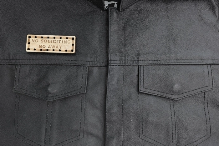 No Soliciting Go Away Oak Wood Patch measures 3.5x1.25. Laser cut and engraved right here in Florida USA.