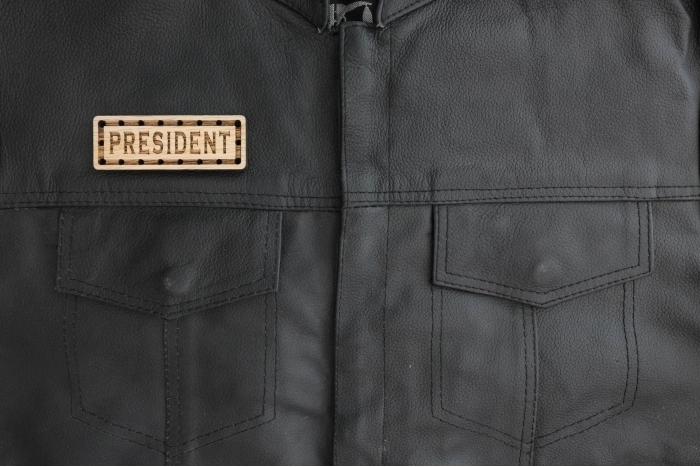 President Solid Oak Laser Engraved Wooden Patch measures 3.5x1.25. Laser cut and engraved right here in Florida USA. We make these so you can decorate your motorcycle jacket by sewing on this wooden patch through the holes. This version is made out of quarter inch thick solid oak. You can also, at your own discretion, stick a peel and stick magnet on the back and use it as a fridge magnet. You can nail or glue it to a wall as decor. You can add a key ring to one of the corner holes and use it as a keychain.