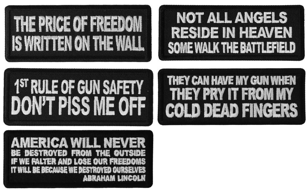 Freedom and Guns Patriotic Warfare Sayings in White over Black Twill Iron-on or Sew-On Embroidered Patches Set of 5