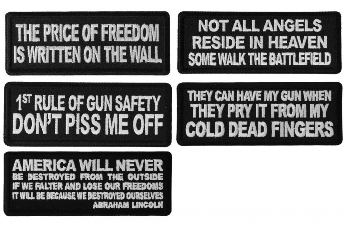 - Freedom and Guns Patriotic Warfare Sayings in White over Black Twill Iron-on or Sew-On Embroidered Patches Set of 5