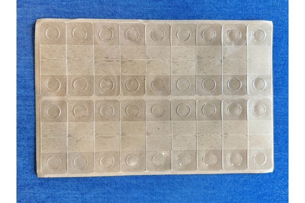 These plastic hanging tabs can be stuck on the back of our iron on patches to easily display them vertically on grid walls or slat walls. Each tab measures 0.8 inches by 1.25 inches. They come in sheets with 36 tabs. This makes peeling them off easier and faster than using tabs that have individual backings on them. We sell them by the sheet. Try them, you'll love them. Please note these tabs will work for patches with plastic backings. All patches we sell (with the exception of blanks) feature plastic iron on backings. If you were intending to hang cloth backing patches with these peel and stick tabs we don't recommend them.